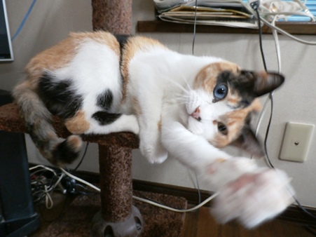 豆ちゃん、お気に入りの場所でカメラにちょっかい出してます。