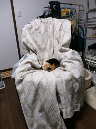 つい出来心で買ったマッサージ椅子に爪とぎ防止用のカバーをかけているんですが、その上に丸まって豆ちゃんが寝ています。すっかり猫ベッド化したマッサージ椅子。いや、爪とぎ化するよりも、ずっとマシです。