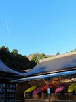 上空に飛行機雲。向こう側は弥彦山山頂方向。