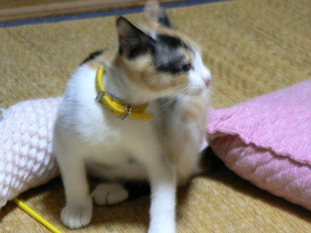 が、ここは、ローテーションでぷーちゃんのしていた黄色だろう、ということになりました。本当なら青が先なんですが、青は我が家のオス猫の色ですので。