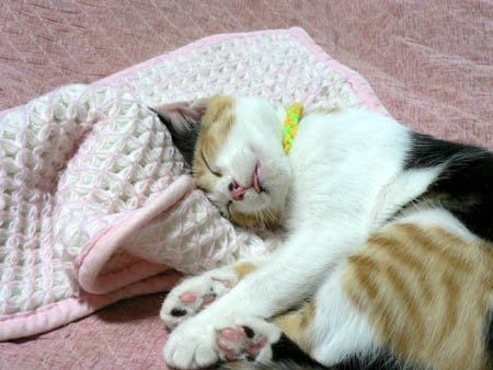 色は、首輪自体の色に限りがあって、一代目のチョビからミユキまでの5匹で使い切ってしまったので、6匹目のきゃっこらさんは変化球で黒い色の首輪になりまして、では、豆ちゃんは何色にするか悩みました。