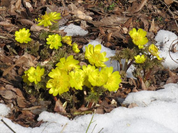 雪なので福寿草は咲いているのかしらん、と思ったら、福寿草ってば、雪を割って出てくるのね。