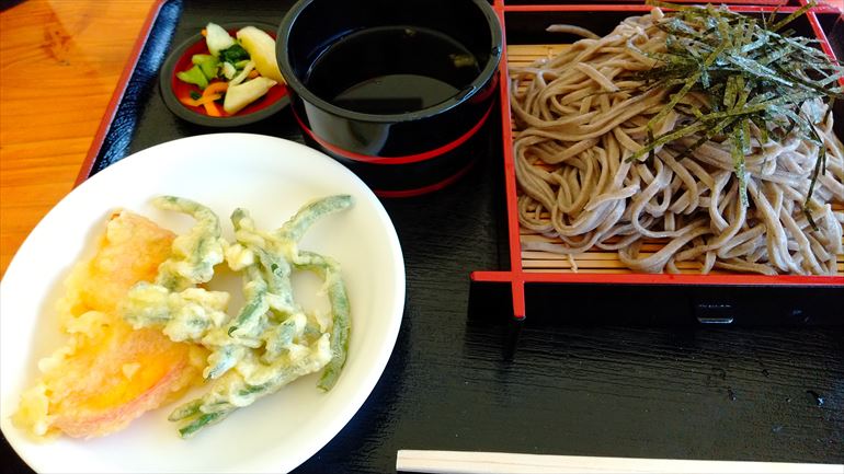 これ、今日食べたおそば。魚沼市の「げんたん」地元産のそば粉で、地元のじいちゃんがテントみたいな小屋で作ってます。そば一人前700円。てんぷら一皿100円。テンプラは選べるよん。
