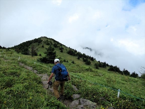 さすがに白い雲が山の下には漂っていて、近くの山さえ見えない状態だったんですが、以前に湯ノ丸山に登った時はもっと霧が濃くて、近くどころか自分の手の先さえ見えない状態だったので、かなりマシでした。