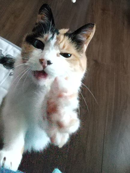 今回は私の膝に手をおいて、んーーーっと片手を延ばして伸びをする豆ちゃん。