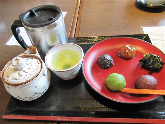 江口だんごさんのだんごセット。お煎茶。ホントは串だんごなんだけど、このセットなら5つの味をひとつずつ味わえるので、お得です。