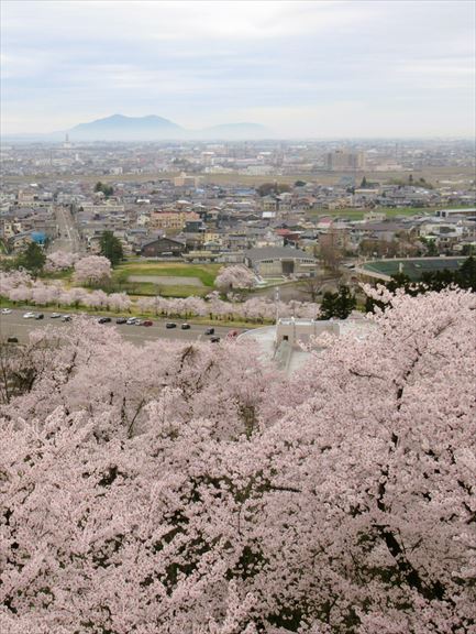 資料館の展望台から見た弥彦方面。さくらのじゅうたんです。