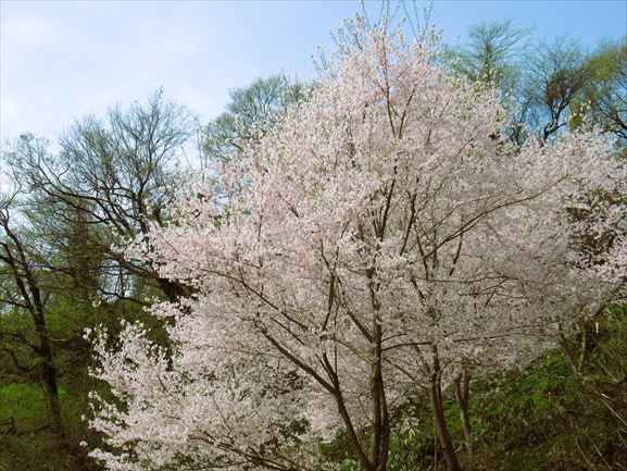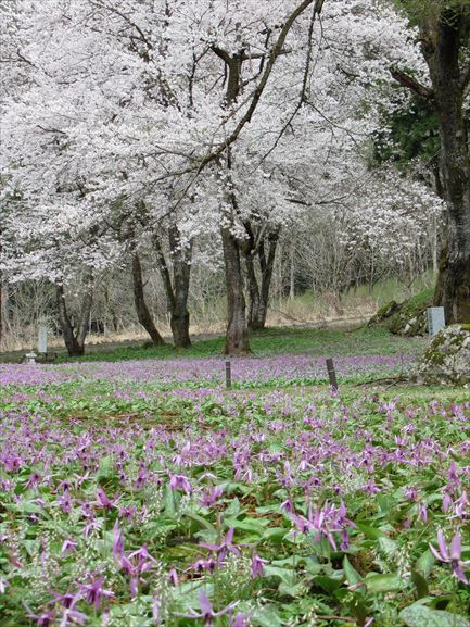 城跡の石碑のある場所の桜とカタクリ。見頃でした。