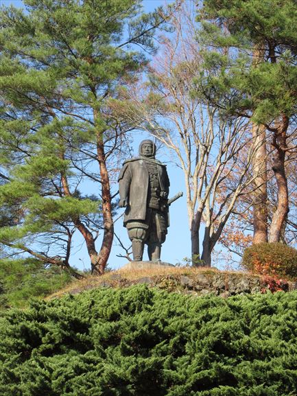 下は、入り口のお土産屋さんのおかみさんが教えてくれた謙信公の銅像がいちばんかっこよく見える場所から撮影した写真です。なんのこたない、お土産やさんのベンチから撮影するんですけどね。