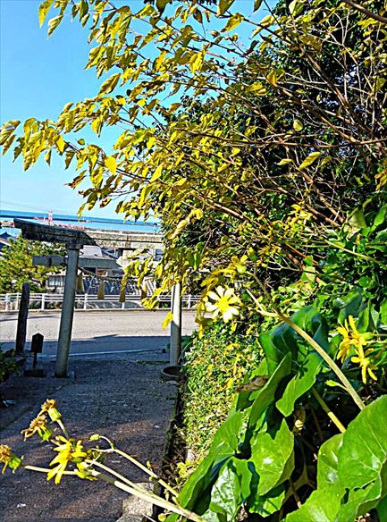 つわぶき坂に上る坂の途中のつわぶき。振り返ると、寺泊の街並みと海。