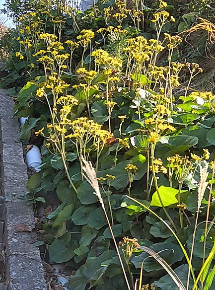 道路の法面一面がつわぶきの花だらけなんです。