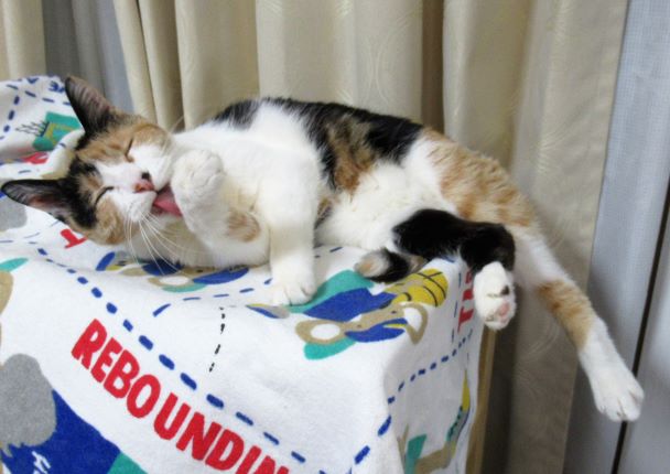 猫用に占拠されたワゴンの上で毛づくろい。なんで足が落ちているのよ。