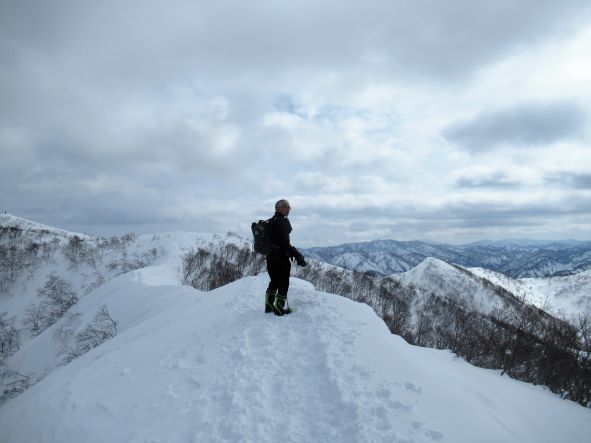 登りはじめは晴れていたんだけど、だんだんと雲が出てきまして、青空の雪景色は見られなかったし、菅名岳まで行ってしまうと沢沿いの道を下る必要があって、それは私としてはイヤだったので、大蔵山からちょっと進んで見晴らしのいい場所で昼食をしてピストンで戻ってきました。