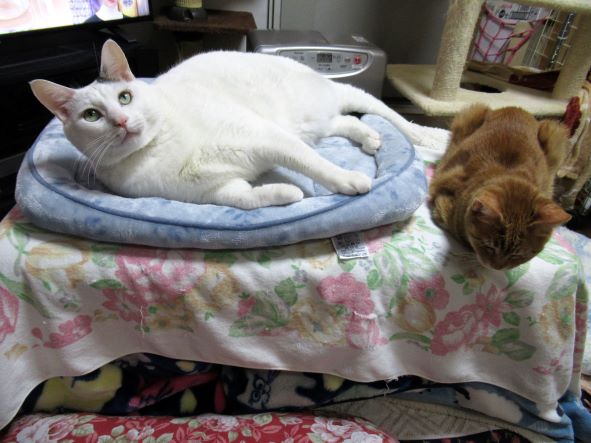 同じこたつの上で寛いています。うーむ、きゃこの2倍あるな、九は。
