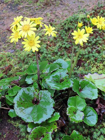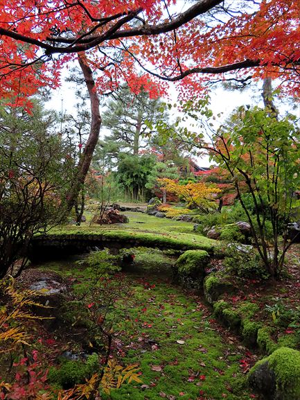 松籟閣のお庭に咲いていたツワブキ。苔の池にかかる苔の橋。