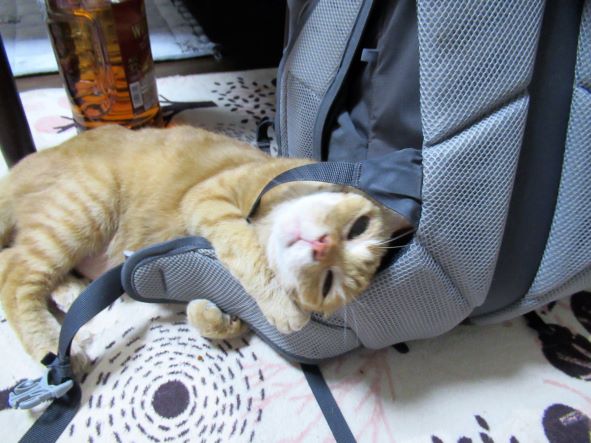 昨日の白山登山で汗まみれになったダンナのリュックにスリスリするきゃこちゃん。