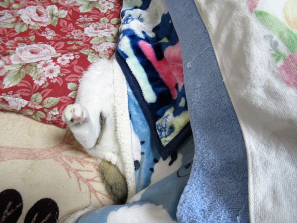 コタツから足だけ出ています。しかも、上向いて。この猫はまったく・・・。