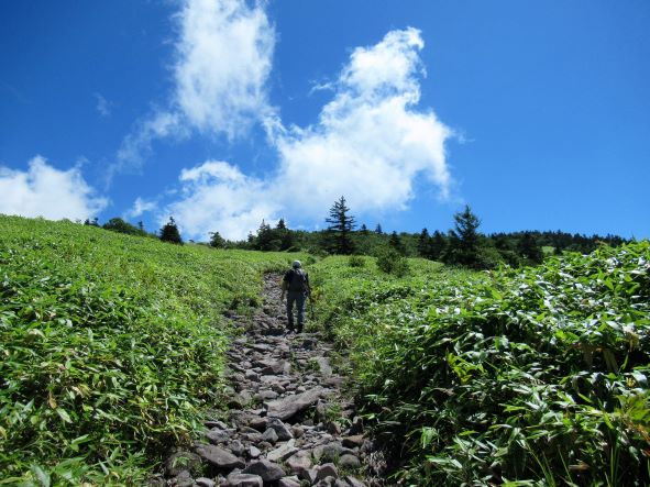 峰の原高原から登るというマイナーなコースでして、これが遮るもののない笹の原をひたすらガンガン登る道。