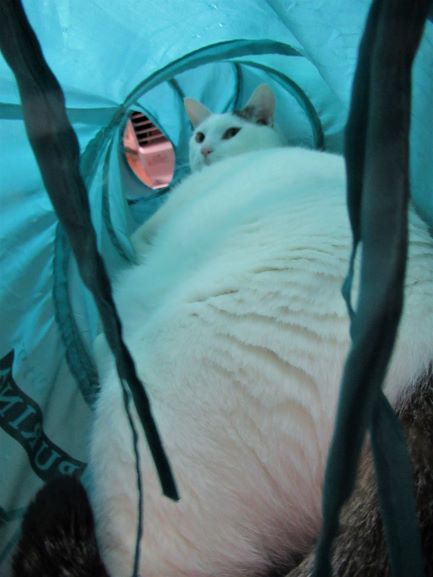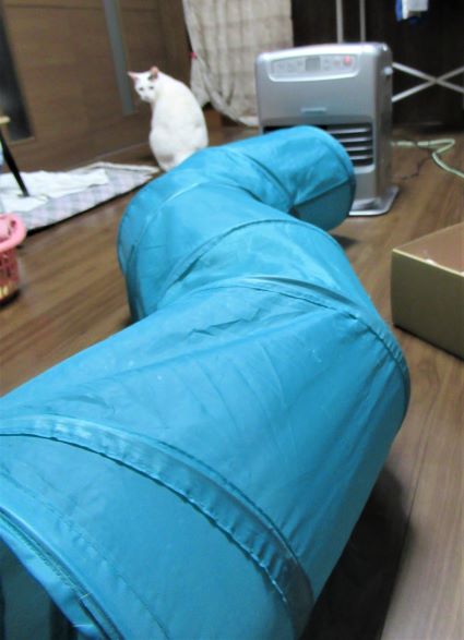 ヒーターの前に設置したこの猫用の筒の中。考えたな、九。