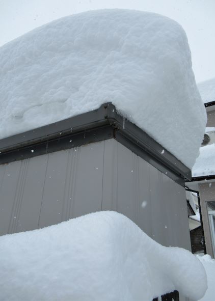 これ、1月10日、今日の物置を庭から見た図。しくしくしくしく。