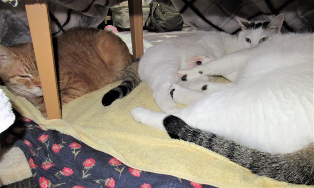 最近八っちゃんの写真がないなぁと思って探したら、今月の初めに奇跡のスリーショットを撮影してました。手前に九のでっかいお尻。左にきゃこちゃん。こたつの中では一緒になれるのね。