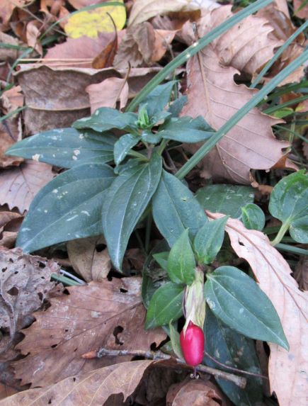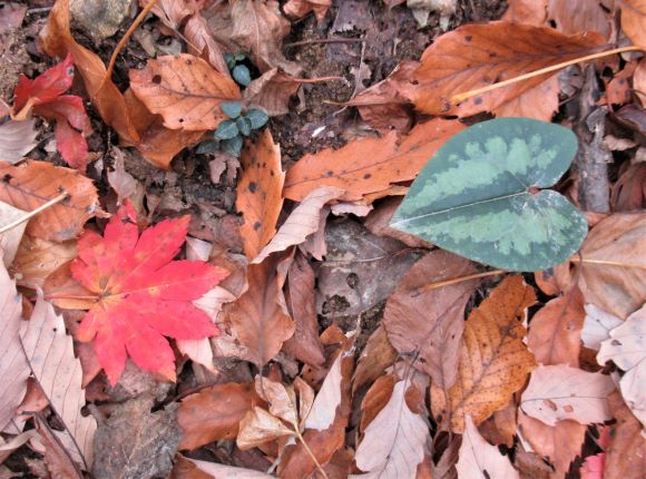 赤い葉っぱと緑のカンアオイの葉っぱ。