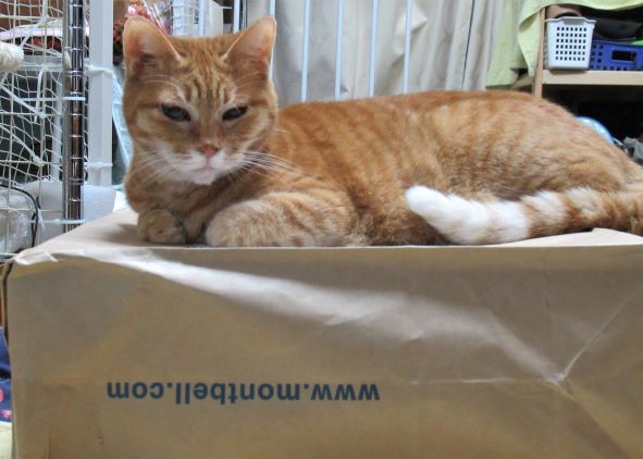 ダンナの買ったモンベルの登山靴の箱。開封する前にきゃこちゃんの座布団になりましたとさ。
