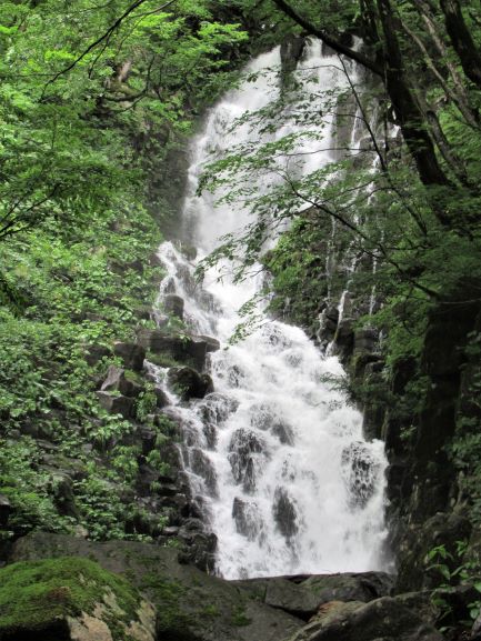 ここ数日の雨のせいで、大尾不動滝は増水していて、キューブ状の岩に水流が当たってきれいな分岐瀑になるはずが、なんか豪瀑になってました。