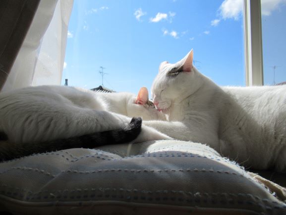 今日の写真じゃないんですが。よく晴れた午後、2階でPC作業をしている時にそばの窓辺で寛いでいる白猫兄弟を撮影しました。白猫と青空って合うのね。
