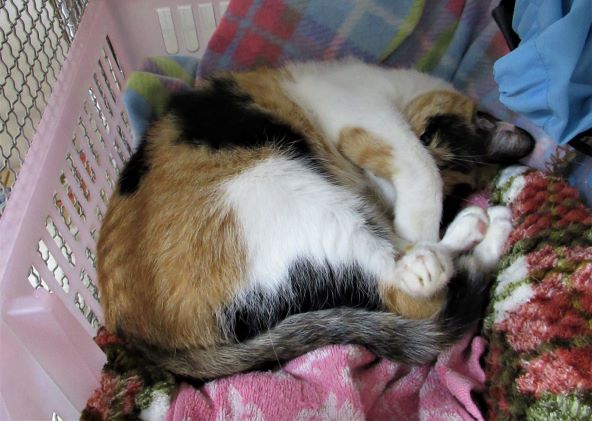 猫こたつに頭だけ入ってあおむけで寝ている九ちゃんです。