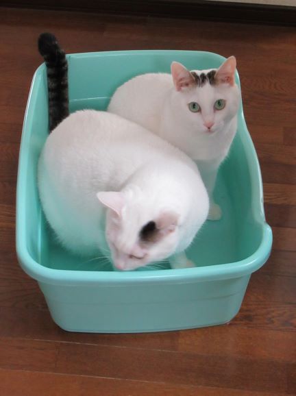 台風が過ぎて晴れ間があったので、猫トイレを洗いました。そのトイレに入るな、白猫兄弟。
