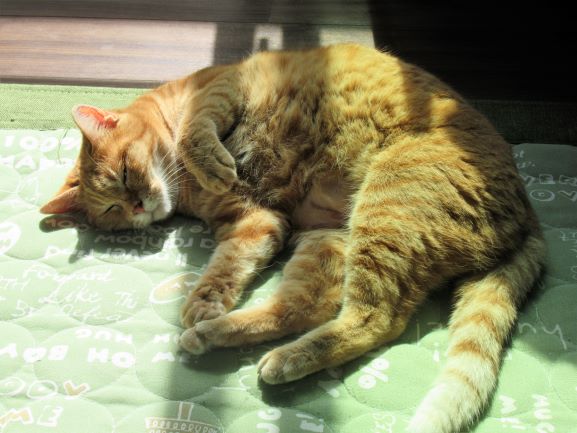 本日のきゃこちゃん。夏場は直射日光が入る窓のカーテンを閉めている場合が多いんですが、今日は私も家にいたので窓を全開して太陽を入れました。そしたらこの暑いのにきゃこちゃんが日光浴してましたとさ。猫には日光も大切だからね。窓閉めてエアコンにしたかったんだけどね。