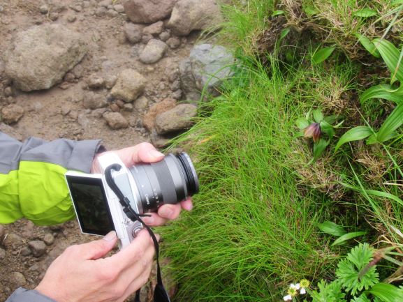 ダンナのカメラの先にクロユリ。 右は山頂。って、何処がどうなってんだか~っ。