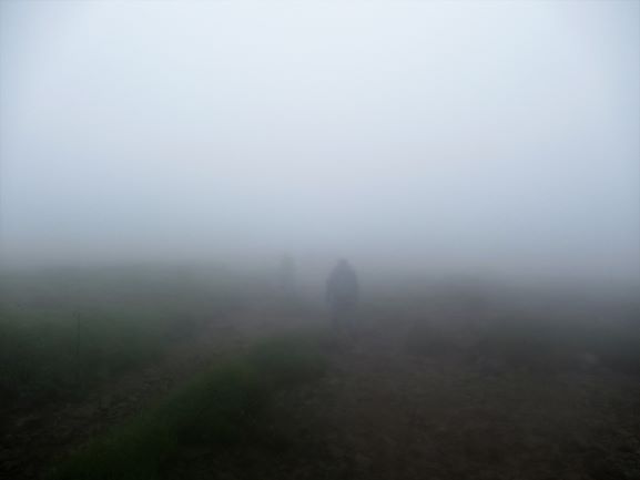雨じゃないけど、霧がたたきつけてきて、メガネが片一方だけ曇って見えず、遠近感がなく、石だらけの道は怖かったです。