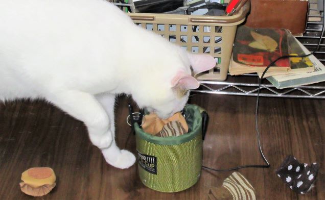 八っちゃんのおもちゃは椅子の足にかぶせるカバー。これをたくさん入れておいた箱から次々出して遊んでいる図です。