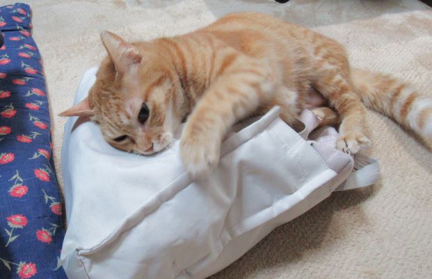 私の出勤用のトートーバッグに噛みついてけりけりしているきゃこちゃんです。それがそんなに憎いか~。