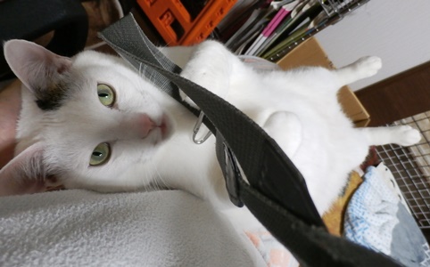 分かりづらいと思いますが、私の膝の上の九ちゃんを私が撮影した図です。そのカメラのストラップにじゃれています。うう、かわいい。