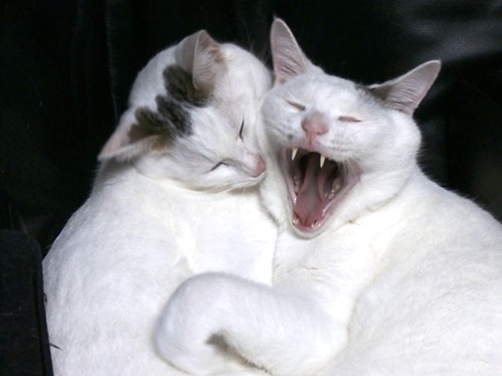 すんごい顔だぞ、九ちゃん。そろそろ涼しくなってきたので、白猫兄弟がくっついて寝るようにになりました。