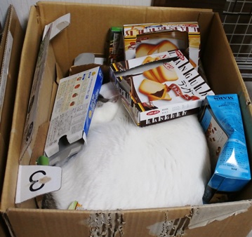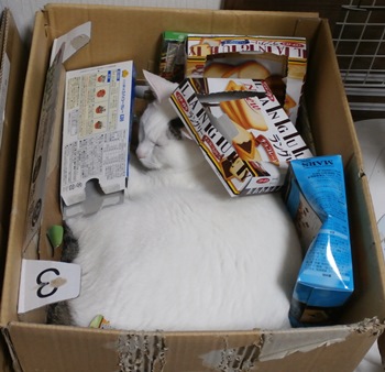 再生用雑紙の入れ物でお昼寝中の九ちゃんでしたとさ。