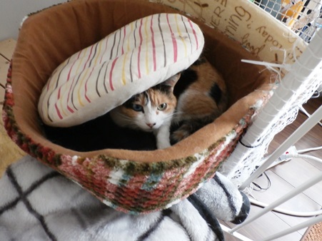 さすがに起きられなくて、吐いた場所だけくるんとくるんで、見えないようにして、また寝ました。ダブルベッドに猫と私で寝てるからね、できるんだけど。