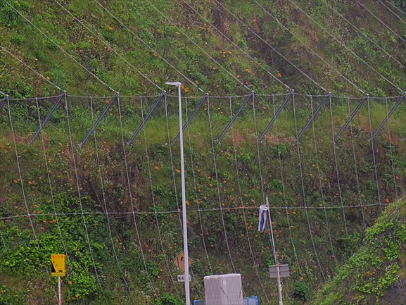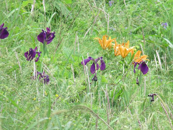 右の写真は、実は道路わきの落石防止フェンスの向こう側にあったスカシユリの大群落。