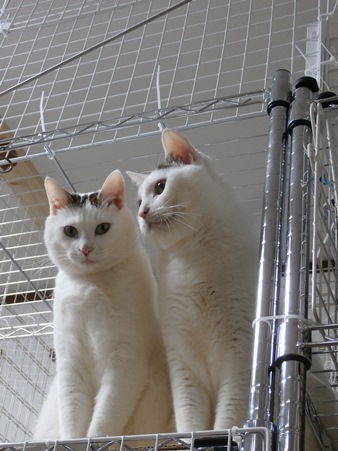 白猫兄弟。彼らがいるのは、きゃこ避難スペースとして利用したワイヤーシェルフの棚の上。つまり、きゃこちゃんの上。おいおい。
