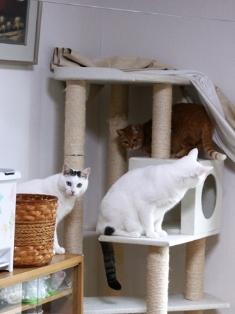 猫タワーに3匹。実はきゃこちゃんは白猫兄弟に好かれています。きゃこちゃんはキライみたいだけどね~。
