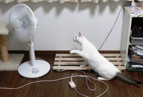 先週に引き続き八っちゃんなんですが、首を振る扇風機に戦いを挑んどいます。