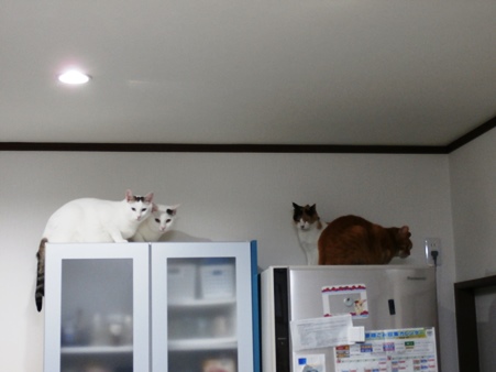 奇跡の4ショット再び(笑) 冷蔵庫と食器棚の上に4匹います。豆ちゃん、ピンチ。唸りっぱなしです。