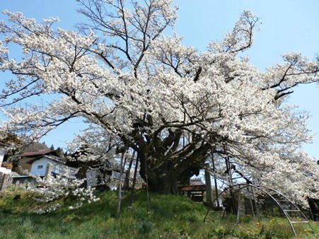あとは、先週行った須坂市にまだ見ごろの桜があるというので行ってみたら、これもまた素晴らしい桜の木に出会えました。さすがに標高の低いあたりはもう色も褪せて散りかけた桜だったんですが、一番奥のちょっと標高の高い場所にある弁天さまの桜という木が見事に満開。