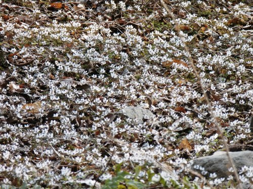 群生地のほんとうに隣の斜面だけど、群生地よりちょっとだけ先にあるので、見落とされる場所にあっちにも増えてたくさん咲いているからぜひ見て行って、と言われて見に行ったら、ホントーにいっぱい咲いていた。怖いくらい咲いてました。セツブンソウ。親指の先くらいの花なんですけどね。