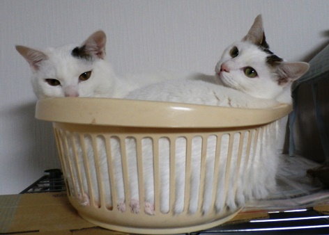 棚の上に籠をのっけて、中にタオルを敷いてあげたら、まんまと白猫が2匹収まりました。