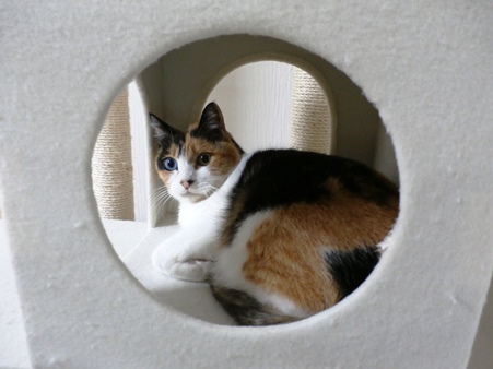 最初のうちはだれも近寄らなかった猫タワー、今ではみんながよく乗っています。豆ちゃん、タワーハウスに立てこもり。