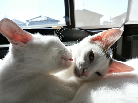 陽だまりに一緒に固まって寝ている八と九はとてもきれいです。